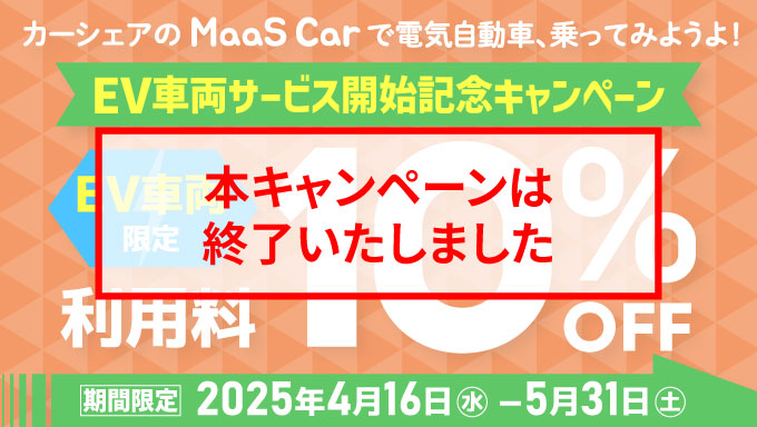 EV車両のサービス提供開始を記念して、EV車両を通常よりお得にご利用いただけるキャンペーンを実施いたします。キャンペーン期間中、対象のEV車両に限り利用料10%OFFにてご利用いただけます。
