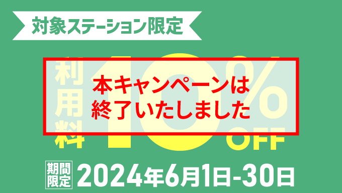 | 特典内容 | 対象ステーションの車両に限り、利用料(時間料金 または 24時間パック料金)10%OFF |