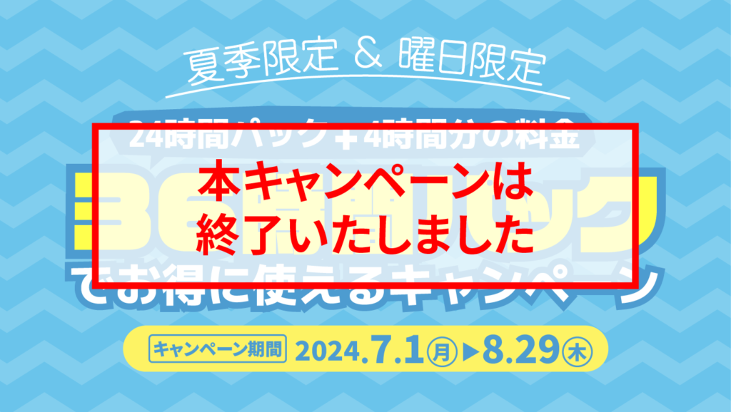 キャンペーン期間中、対象日(月曜日~木曜日(祝日を除く))に利用開始したご利用に限り、1時間単位の時間料金と24時間パック(時間料金10時間分の料金で24時間利用可)に加え、36時間パック(時間料金14時間分の料金で36時間利用可)をご利用いただけます。