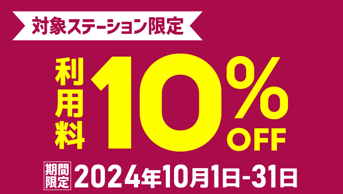 詳細についてはキャンペーン詳細の「【対象ステーション限定】利用料10%OFF(2024年10月)」をご覧ください。