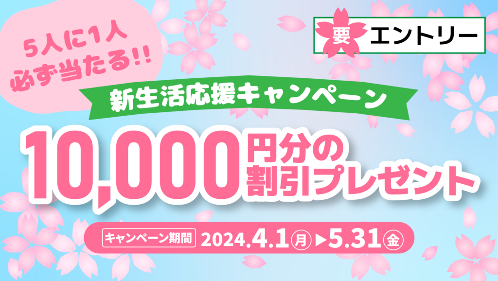 2024年4月1日より、専用フォームからエントリーの上、キャンペーン期間中の2か月間に合計5,000円(税込)以上ご利用いただいた方の中から抽選で5人に1人に「6月に使える10,000円分割引」をプレゼントする「新生活応援キャンペーン」を実施いたします。