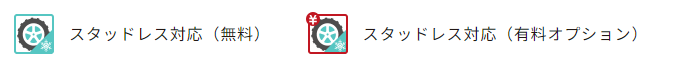 11月下旬頃より、ステーション一覧/各ステーション詳細ページではスタッドレス対応車両について下記アイコンで表示いたします。なお、2025/2026シーズンについては、「スタッドレス対応(無料)」車両の提供はございません。