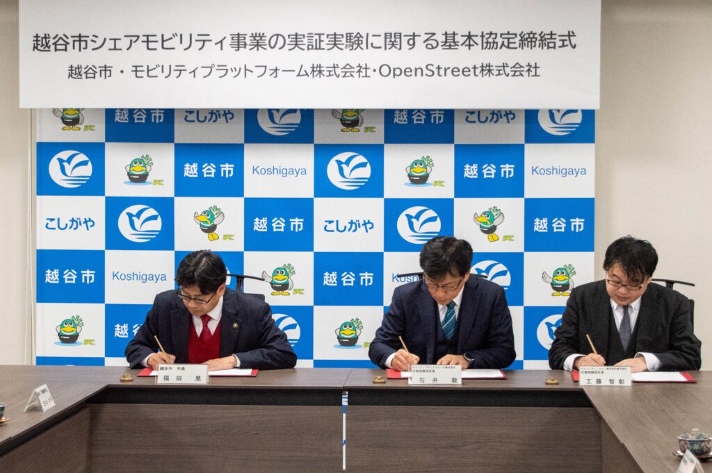 2024年3月26日に、越谷市役所にて「越谷市シェアモビリティ事業の実証実験に関する協定締結式」を開催しました。越谷市の福田市長をはじめ、モビリティプラットフォーム 代表取締役社長 石井、OpenStreet 代表取締役 工藤が出席しました。