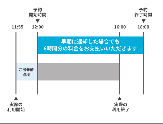 予約開始時間(予約時または予約変更時に指定した利用開始時間)から予約終了時間(予約時または予約変更‧延⻑時に指定した利用終了時間)(※)までが利用料の課金対象となり、利用料をご請求いたします。予定より早い時間でのご返却の場合でも、予約時間での課金となりますのでご注意ください。予約終了時間以降に返却された場合、別途超過料金が発生します。