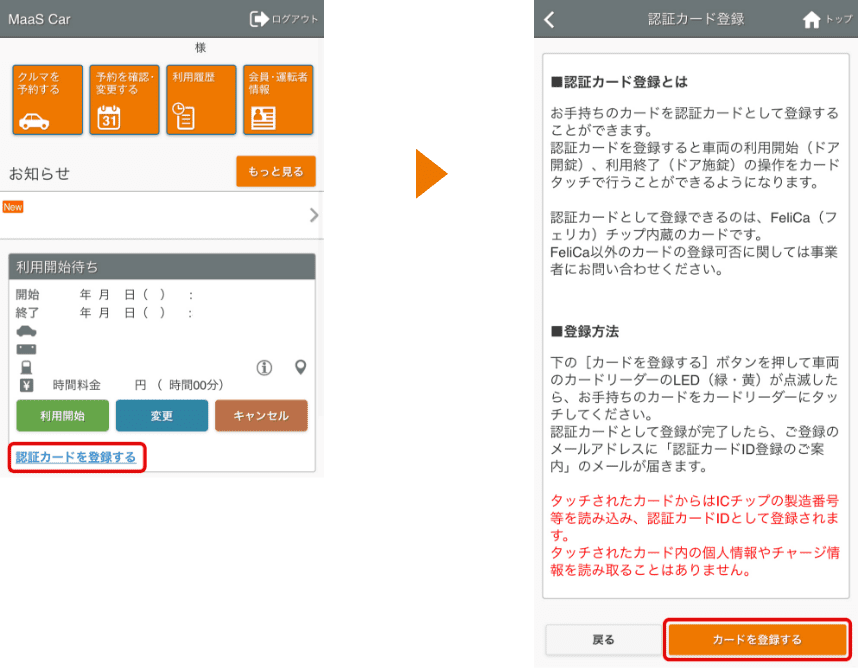 クルマを予約して利用開始前(予約開始時間5分前から)、または利用中にスマホマイページの予約一覧画面の「認証カードを登録する」を押してください。