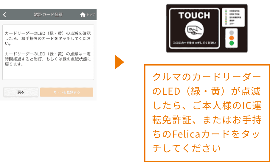 クルマのカードリーダーのLED(緑・黄)が点滅したら、お手持ちのカードをカードリーダーへタッチして、登録完了です。